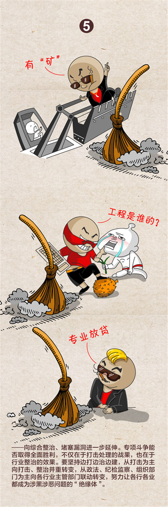 中央紀(jì)委國家監(jiān)委網(wǎng)站近日發(fā)布一組題為《2019掃黑除惡“六個延伸”》的漫畫,對2019年掃黑除惡專項斗爭提出向偵破大案、打財斷血進(jìn)一步延伸,向網(wǎng)絡(luò)空間、新興領(lǐng)域進(jìn)一步延伸,向深挖幕后、打傘破網(wǎng)進(jìn)一步延伸,向依法懲治、快訴快判進(jìn)一步延伸,向綜合整治、堵塞漏洞進(jìn)一步延伸,向固本強基、鏟除土壤進(jìn)一步延伸等六大方向。