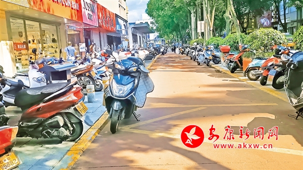 6月23日,金州南路東側(cè),摩托車、電動(dòng)車停放在公交港灣,存在安全隱患。(記者 吳單 攝)