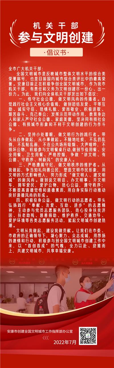 全國文明城市是反映城市整體文明水平的綜合類榮譽稱號,也是目前國內(nèi)城市綜合類評比中的最高榮譽。安康目前正在積極爭創(chuàng)全國文明城市,作為我市機關干部,有責任和義務為文明創(chuàng)建盡一份心、出一份力。為此,我們向全體機關干部發(fā)出如下倡議:
