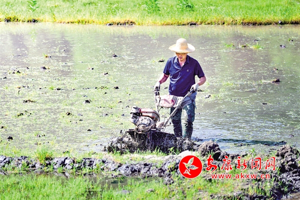 5月1日,石泉縣城關(guān)鎮(zhèn)絲銀壩村百畝水田里,農(nóng)戶操作旋耕機(jī)做好插秧前的各項(xiàng)準(zhǔn)備工作。董長(zhǎng)松 攝