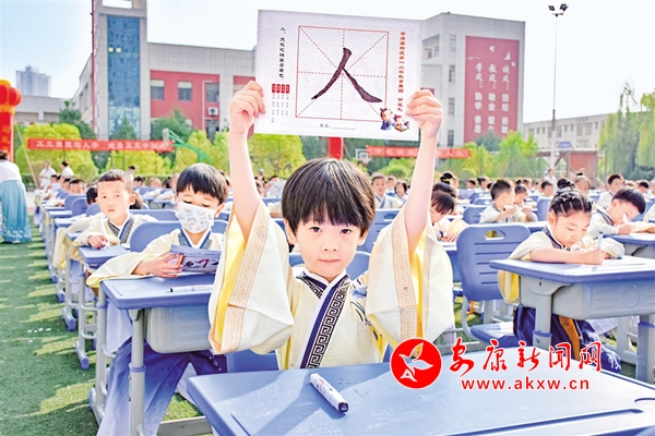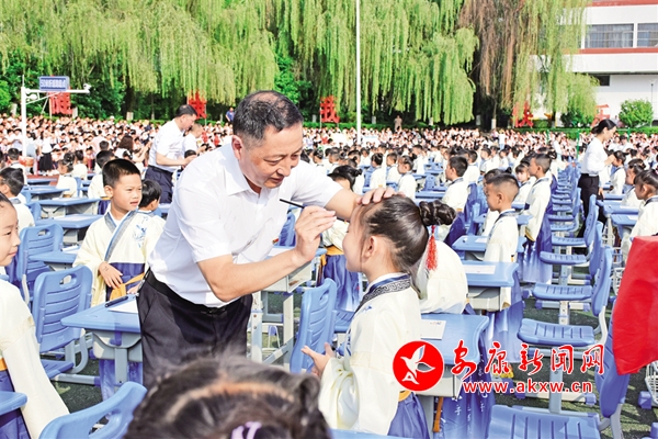 為傳承中國傳統(tǒng)文化,進(jìn)一步加強(qiáng)學(xué)生文明禮儀教育,日前,安康高新區(qū)第一小學(xué)舉行一年級新生開筆禮及優(yōu)秀學(xué)生表彰活動。千名一年級蒙童身著漢服,由班主任帶領(lǐng)跨過啟蒙門,正衣冠、感恩鞠躬、朱砂啟智、擊鼓明志、開筆啟蒙,接受中國傳統(tǒng)文化的洗禮,領(lǐng)略傳統(tǒng)文化的魅力。(張凌云 攝)