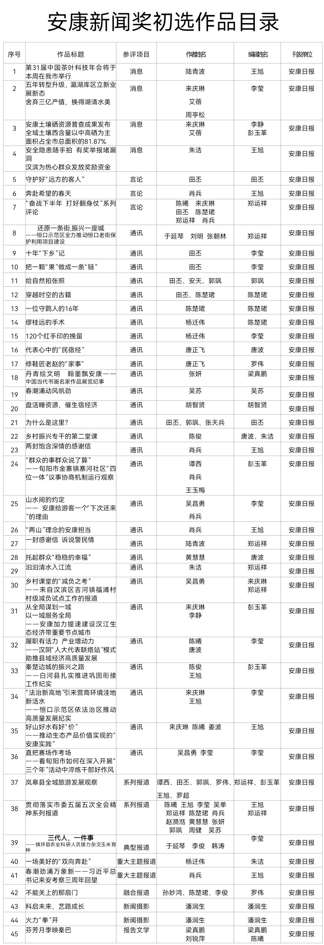經(jīng)過3月20日編委會推薦、社黨委研究決定,擬推薦以下45件新聞作品參評2023年度“安康新聞獎”。公示時間從2024年3月21日至2024年3月27日,公示期5個工作日。如有不同意見,請向安康日報(bào)社機(jī)關(guān)紀(jì)委、新聞管理部反映。