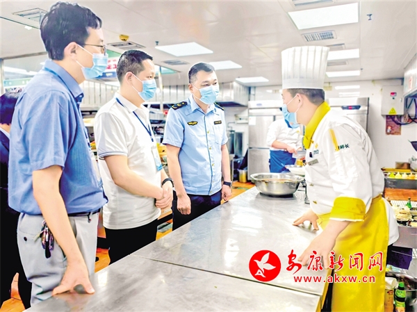 “五一”假日將至,漢濱區(qū)紀(jì)委監(jiān)委會同市場監(jiān)督管理部門對中心城區(qū)酒店餐飲服務(wù)場所開展監(jiān)督檢查。圖為檢查組在某酒店后廚了解情況。鄭時根 攝