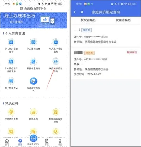 在“服務(wù)”菜單界面,點(diǎn)擊進(jìn)入“家庭共濟(jì)綁定查詢”頁面,可以查詢授權(quán)者和使用者的角色信息。
