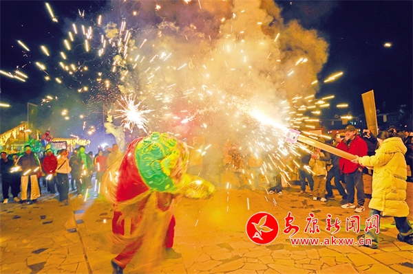夜幕降臨,在中壩作坊小鎮(zhèn)廣場(chǎng)上,音樂響起,熊熊篝火燃燒,伴隨著動(dòng)感的音樂,游客與居民們手牽手,肩并肩,圍著篝火載歌載舞。而最吸引人的還是舞火龍、火獅子表演,在璀璨煙火中,火龍飛舞盤旋,火獅子搖頭晃腦,騰挪跳躍,威風(fēng)八面,現(xiàn)場(chǎng)不少游客噴起煙花,花燒得越旺、鑼鼓聲越急,獅子舞得也越歡快,大家共同享受著這場(chǎng)精彩紛呈的非遺文化盛宴。
