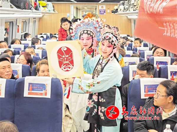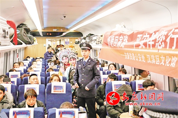 火車穿越秦巴山水間,途中,來自安康漢調(diào)二黃研究院的專業(yè)演員和地方民間漢調(diào)二黃愛好者們一同表演了國(guó)家級(jí)非物質(zhì)文化遺產(chǎn)——漢調(diào)二黃經(jīng)典戲曲演唱,并為旅客們講解漢調(diào)二黃戲曲知識(shí),與旅客們開展互動(dòng)交流,讓旅客親身體驗(yàn)漢調(diào)二黃戲服道具,感受漢調(diào)二黃的獨(dú)特藝術(shù)魅力。來自漢濱區(qū)文化館的漢濱剪紙技藝傳承人為旅客們展示講解了安康市級(jí)非物質(zhì)文化遺產(chǎn)——漢濱剪紙技藝,向參與互動(dòng)的旅客送上了親手創(chuàng)作的漢濱剪紙作品,提前送上新春祝福。活動(dòng)中,西安鐵路公安局安康公安處的民警們和文藝工作者們一同宣傳普及了反詐知識(shí),進(jìn)一步提升旅客的安全防范意識(shí)。
