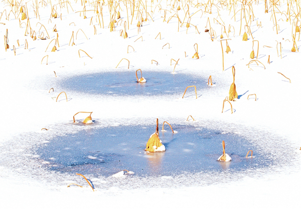我的攝影創(chuàng)作圍繞生命的痕跡、時間的隱喻兩個主題。在《嘉實(shí)擷芳·野圃瑤音》中,菜園的微觀生態(tài)被賦予交響樂般的節(jié)奏——葫蘆藤的螺旋曲線是生命的律動,西紅柿根莖的垂直排列是生長的秩序,蚜蟲蝕痕的細(xì)節(jié)則暗喻生態(tài)的共生與抗?fàn)?。而在《澄漪棹影·沙月溯光》里,榮成海岸的冬夏對比成為時間的隱喻,結(jié)冰湖面上的凋敗蓮蓬是流逝凝固的時光,夏日海邊的金色水洼則是流動的永恒。我癡迷于捕捉這種矛盾與共生——就像用冷暖色調(diào)碰撞出畫面的張力,也用虛實(shí)構(gòu)圖處理每一張照片,期待每一張照片是個性鮮明,讓人耳目一新。