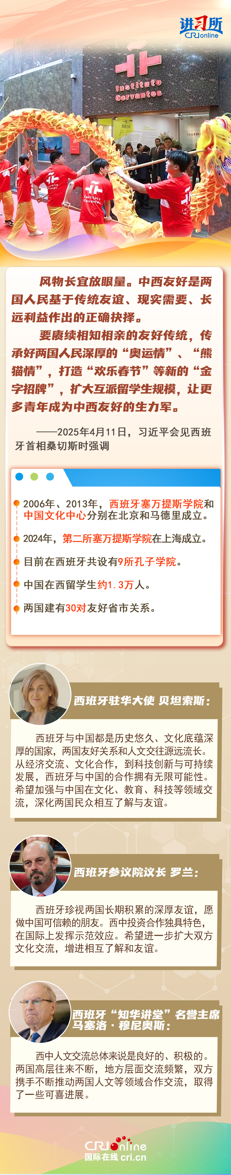今年是中西全面戰(zhàn)略伙伴關系建立20周年,也是中歐建交50周年。多年來,中西兩國領導人保持密切互動,秉持互尊互信、互利共贏精神,兩國在深化貿(mào)易、投資、科技創(chuàng)新、綠色能源等領域取得豐富合作成果,雙邊關系走在中國同歐洲國家關系前列。在西班牙人士眼中,良好的對華關系對西班牙、歐洲和世界具有重要意義,將會為兩國人民帶來更多實實在在的福祉,也將共同創(chuàng)造更美好的未來。