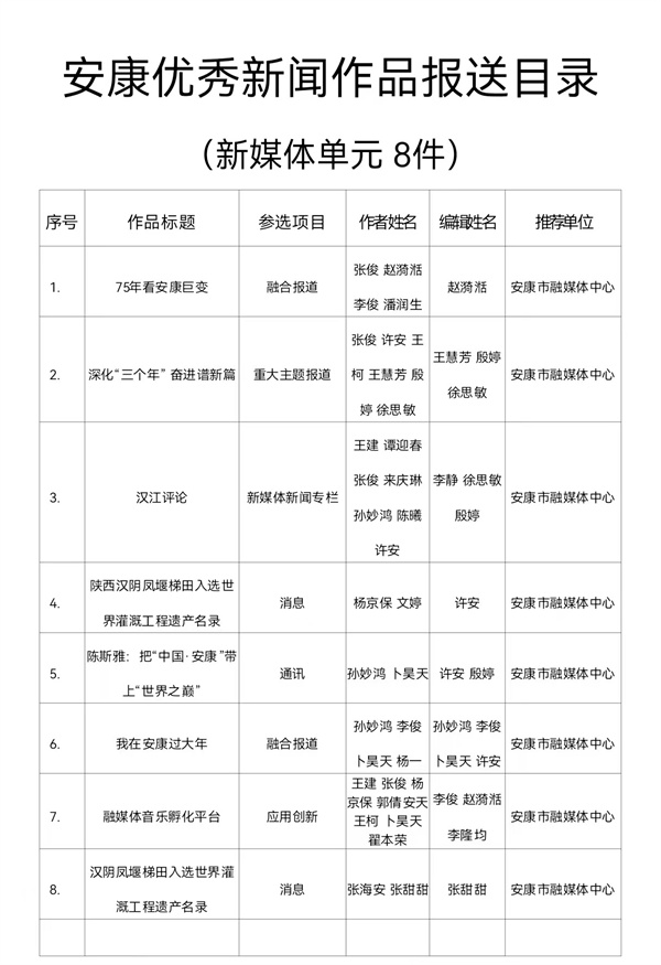 根據(jù)《關(guān)于開展2024年度安康優(yōu)秀新聞作品、安康市優(yōu)秀新聞工作者推選工作的通知》(安記協(xié)〔2025〕04號)文件要求,經(jīng)推薦、領(lǐng)導(dǎo)審核,安康市融媒體中心推薦參評2024年度安康優(yōu)秀新聞作品97件(報紙單元58件,廣播電視單元31件,新媒體單元8件)?,F(xiàn)將報送作品目錄(詳見附件)予以公示。