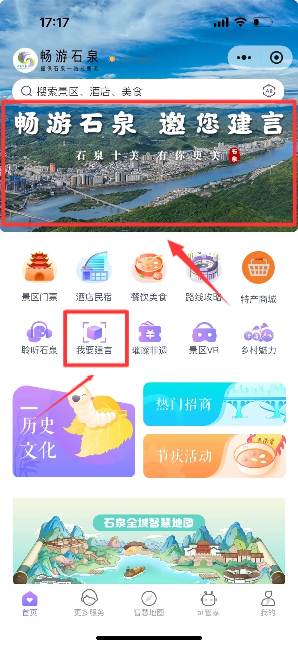 1.官方賬號(hào):打開“暢游石泉”小程序,點(diǎn)擊“暢游石泉 邀您建言”意見建議征集頁(yè)面,提交建議。