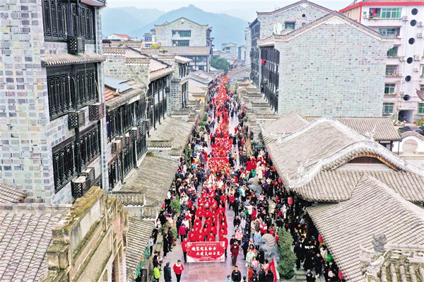 一縷微風(fēng)穿過,黃昏的老街各種顏色交織碰撞,給人無限遐想。街道兩旁,店鋪一家挨著一家,幾家店外排著長隊(duì),生意火爆。漢服、旗袍走秀、火獅子、舞龍、漢調(diào)二黃、花鼓戲入眼入耳?;秀遍g,昔日的場景猶如一幅畫卷徐徐展開。
