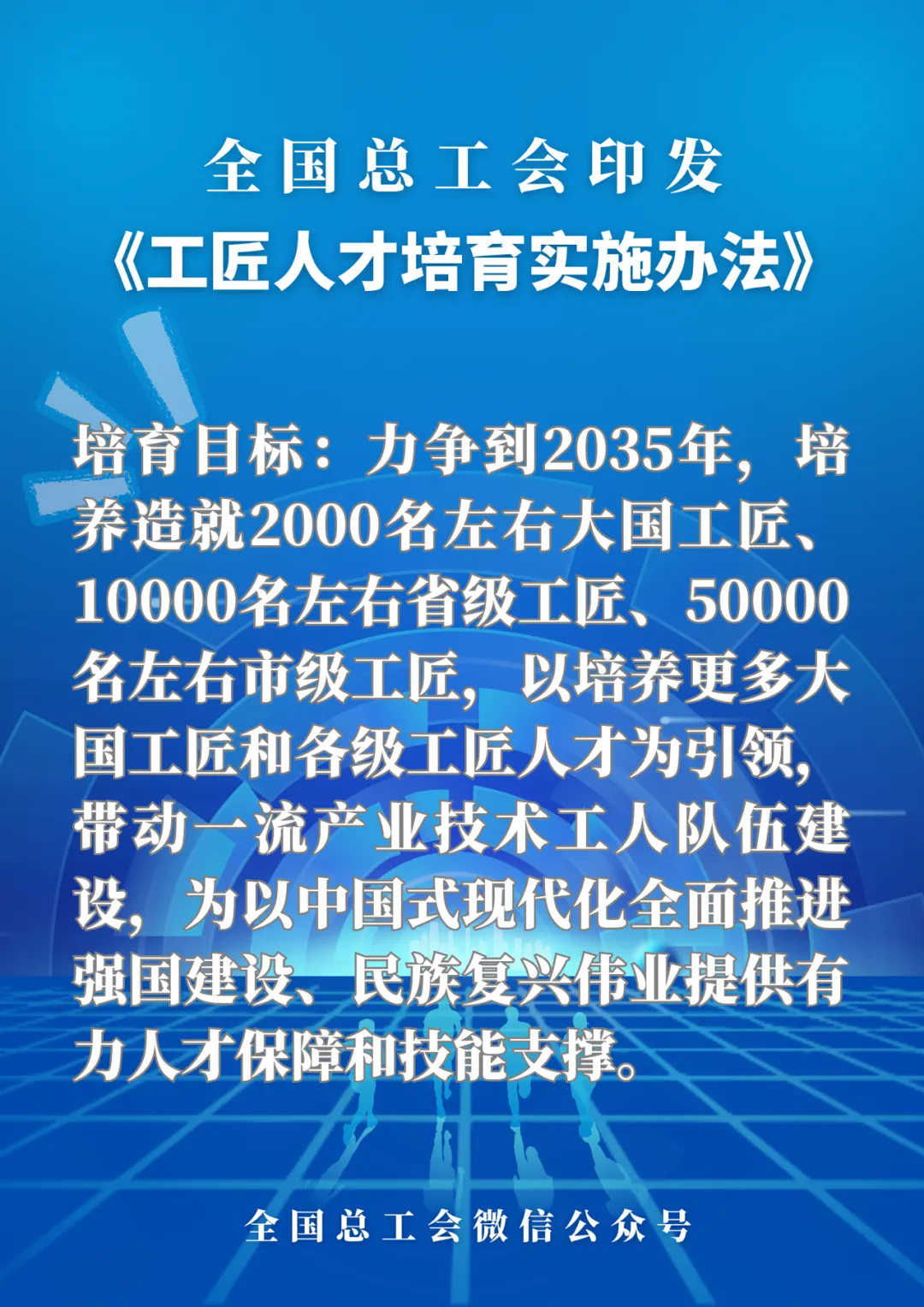 第二條 培育目標(biāo)是,力爭到2035年,培養(yǎng)造就2000名左右大國工匠、10000名左右省級工匠、50000名左右市級工匠,以培養(yǎng)更多大國工匠和各級工匠人才為引領(lǐng),帶動一流產(chǎn)業(yè)技術(shù)工人隊伍建設(shè),為以中國式現(xiàn)代化全面推進強國建設(shè)、民族復(fù)興偉業(yè)提供有力人才保障和技能支撐。