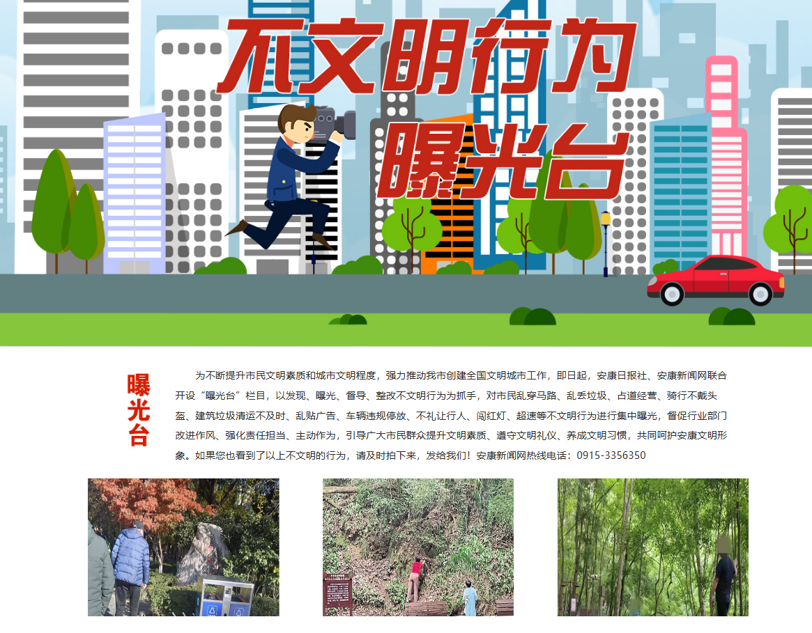 安康新聞網(wǎng)繼續(xù)充分發(fā)揮輿情監(jiān)測和輿論監(jiān)督作用,以高度負責(zé)的態(tài)度,及時監(jiān)測上報重大輿情信息。開設(shè)《不文明行為曝光臺》輿論監(jiān)督專欄,集中曝光身邊的不文明現(xiàn)象、行為,發(fā)布消息報道19篇,引導(dǎo)市民群眾自覺規(guī)范文明行為,主動融入城市文明創(chuàng)建熱潮,為提升市民文明素質(zhì)和城市文明程度貢獻媒體力量,體現(xiàn)地方黨媒的責(zé)任與擔(dān)當。