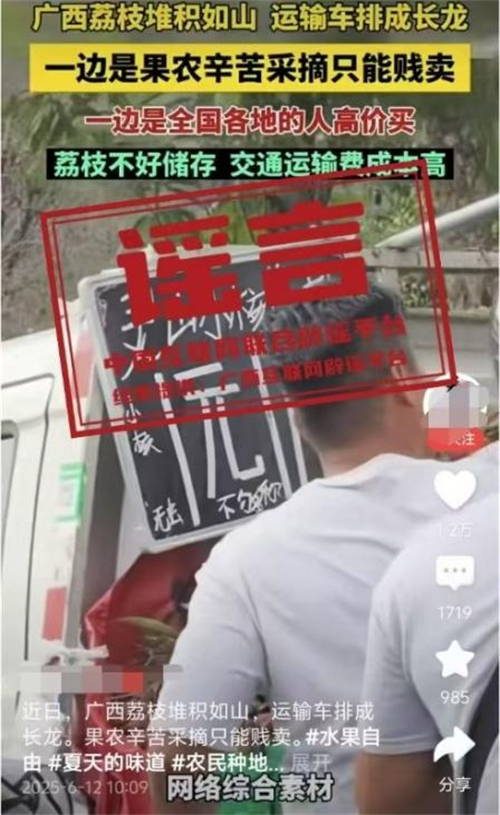 真相:6月12日,網傳“近日廣西荔枝堆積如山,運輸車排成長龍。果農辛苦采摘只能賤賣”的視頻,畫面顯示荔枝堆積和“靈山荔枝1元”字樣。經核查,視頻內容并非發(fā)生在靈山縣。目前,靈山荔枝“妃子笑”等中熟品種逐漸批量上市,大規(guī)模上市時間為6月20日左右,當前荔枝產銷有序開展,并未發(fā)現(xiàn)個別媒體報道的“荔枝滯銷賤賣”“采摘堆積成山”“運輸車排成長龍”的情況,也沒有發(fā)現(xiàn)價格低到1元的荔枝出售。(來源:“廣西互聯(lián)網違法和不良信息舉報”微信公眾號)