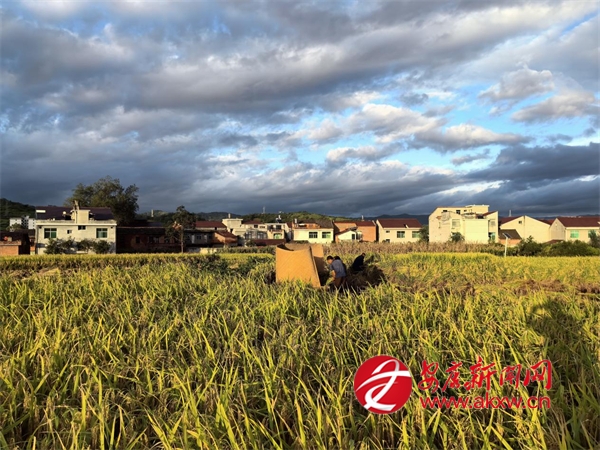 走進(jìn)新河村,陽光灑在沉甸甸的稻穗上,飽滿的谷粒泛著金黃光澤。微風(fēng)拂過,連片稻田掀起層層稻浪,裹挾著清新的谷物香氣彌漫田間。稻田里,農(nóng)機(jī)手熟練地操控著收割機(jī),在田間來回穿梭,機(jī)身所過之處,水稻快速完成脫粒、秸稈分離,金黃的稻谷源源不斷送入機(jī)倉,實(shí)現(xiàn)顆粒歸倉;為進(jìn)一步加快水稻收割進(jìn)度,幾位村民則支起拌桶,手持稻把用力拍打,沿用傳統(tǒng)打谷技藝同步搶收,機(jī)器轟鳴聲、打谷聲與村民的歡聲笑語交織成秋日豐收的“協(xié)奏曲”。