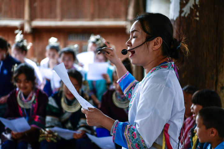 隨著國產(chǎn)動(dòng)畫電影《哪吒之魔童鬧?!凡粩嗨⑿轮袊笆菲狈考o(jì)錄,參與電影配樂的貴州省榕江縣三寶侗寨的楊想妮和“舞樂蟬歌”團(tuán)隊(duì)為更多人所熟知。樂團(tuán)成員懷揣“用音樂傳遞侗族文化,讓世界聽見侗族大歌”的共同夢想,將侗族大歌推向更廣闊的舞臺(tái)。這是2025年4月22日,楊想妮在貴州省黎平縣肇興鎮(zhèn)廈格侗寨教前來研學(xué)的孩子們唱侗歌。