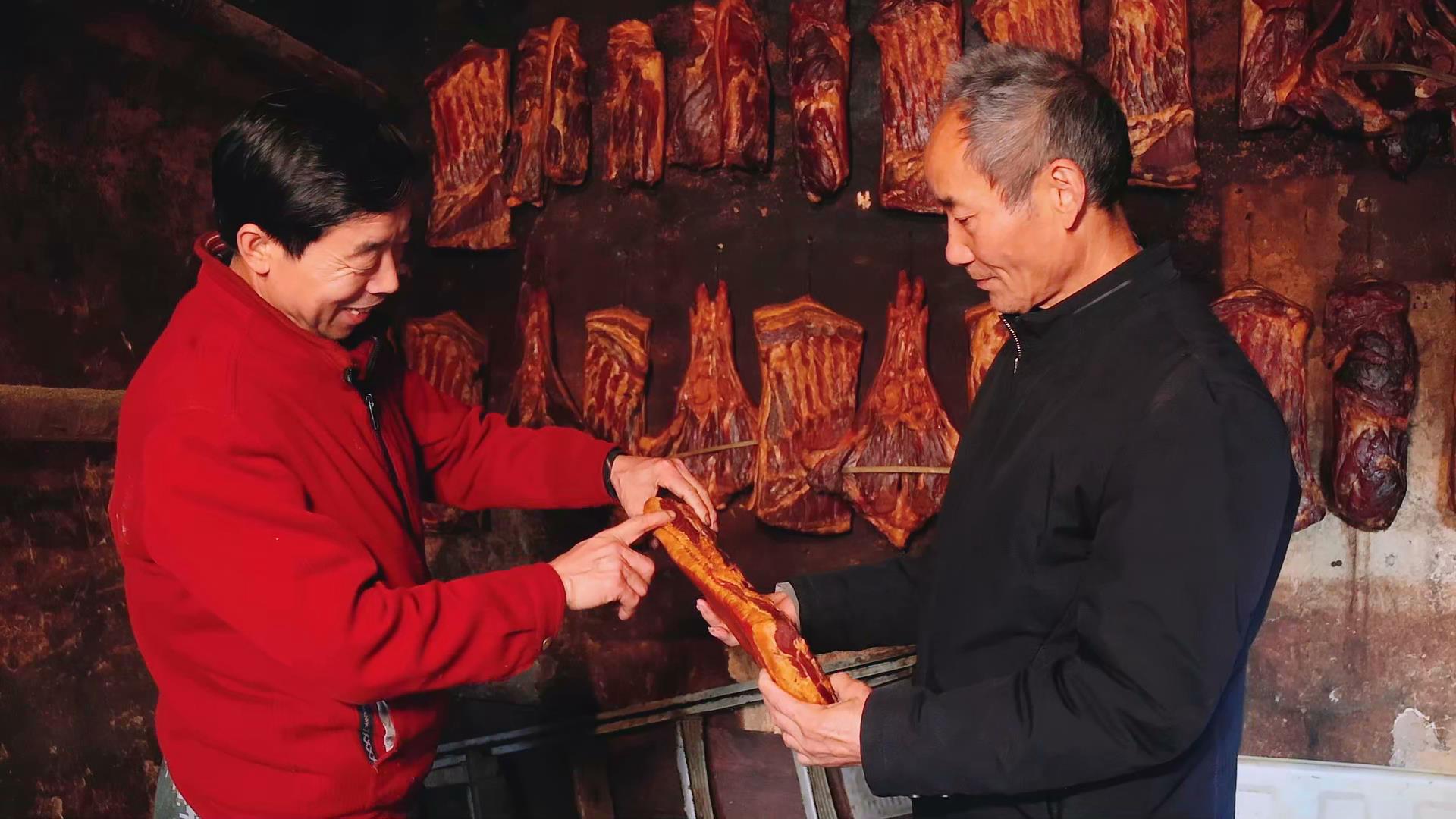 石泉縣城關(guān)鎮(zhèn)珍珠河村村民王全勇(左)熏制臘肉已有十來年,是當(dāng)?shù)赜忻呐D味制作能手。今年,他熏制的上萬斤臘肉和香腸早早就被預(yù)訂,有的還通過網(wǎng)絡(luò)被賣到北京、山東等省市。 郭依萍 攝