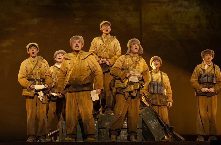 這是音樂劇《尋找李二狗》的演出劇照(2025年4月7日攝)。該劇以抗美援朝偉大歷史為背景,取材自志愿軍第39軍116師真實故事,通過當代青年常衛(wèi)國借助爺爺的回憶錄穿越回1950年鴨綠江畔的舞臺設定,展開兩代青年的跨時空對話。2025年11月,該劇榮獲第十八屆文華劇目獎。