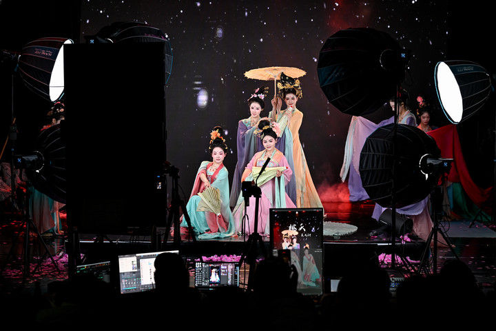 陜西省歌舞劇院的舞蹈演員在直播間進行“團播”表演(2025年12月25日攝)。“團播”這一多人演藝直播新形式,正成為專業(yè)文藝院團開辟線上“第二舞臺”、推動傳統(tǒng)文化創(chuàng)新表達的新嘗試?!柏Q屏化”“快節(jié)奏”的改編,讓傳統(tǒng)劇目受到越來越多年輕人喜愛。數據顯示,陜西省歌舞劇院“團播”單場最高曝光量超500萬,帶動線下票房增長約10%。