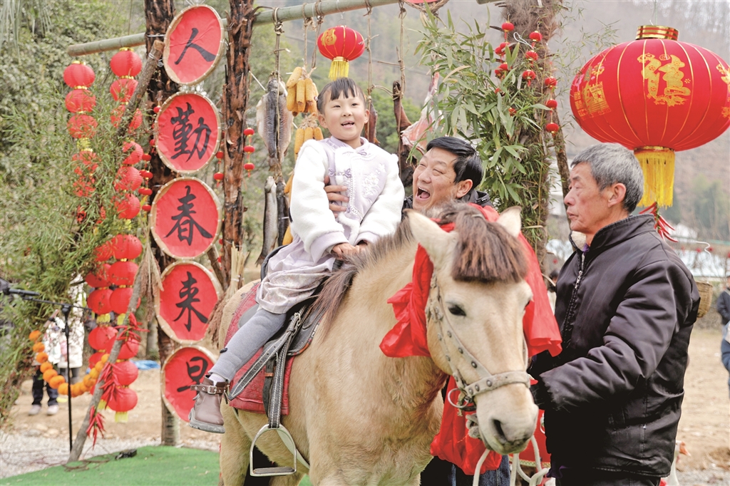 春節(jié)期間,寧陜縣城關(guān)鎮(zhèn)漁灣村舉行“回寧陜過大年”民俗展演。圖為游客體驗?zāi)晁谆顒?。楊?攝