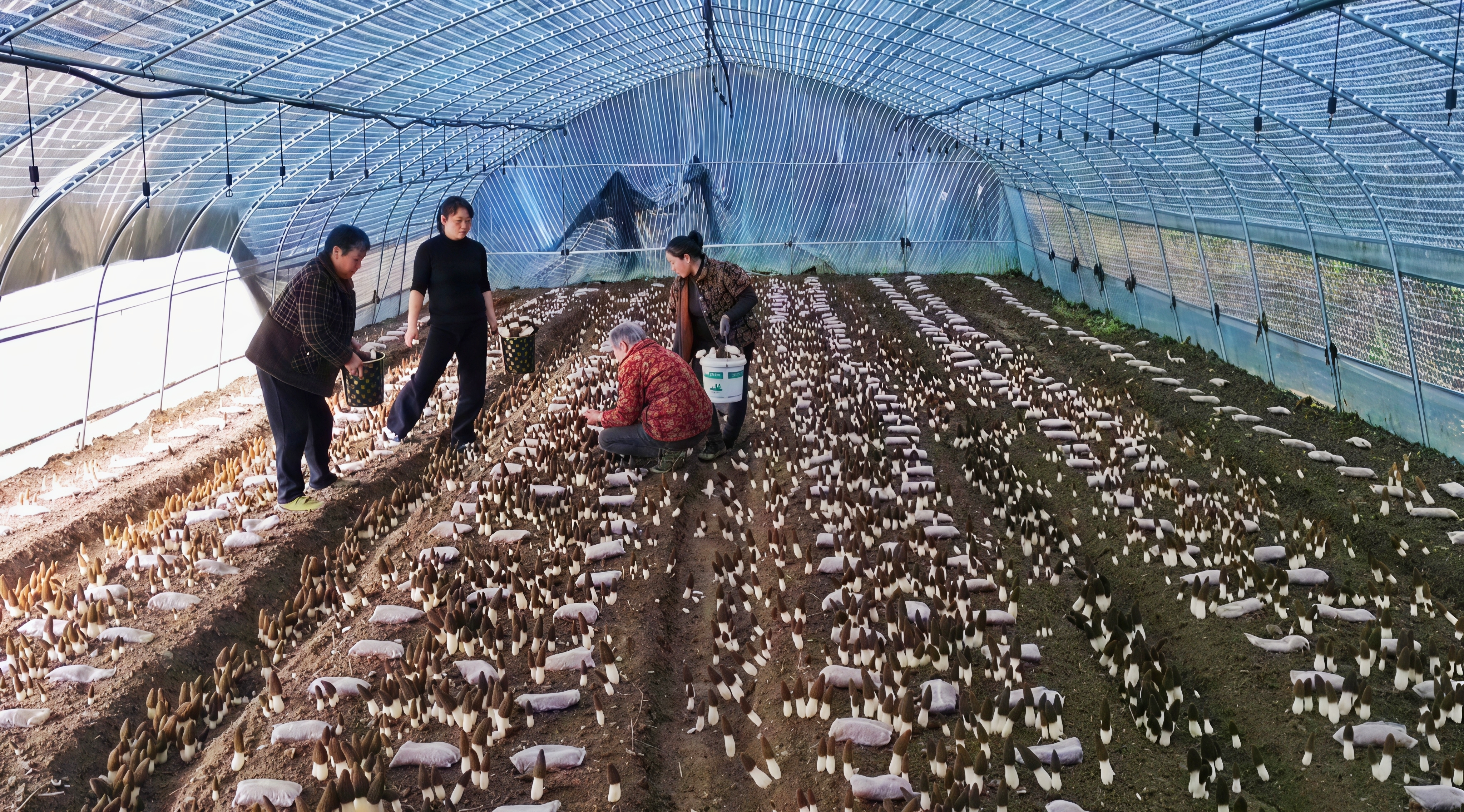 晨光村食用菌標(biāo)準(zhǔn)廠房?jī)?nèi),開春“第一采”同樣火熱。立體層架上,菌袋整齊碼放,一簇簇肥厚鮮嫩的香菇如云朵般鉆出,肉質(zhì)飽滿、香氣四溢。村民們分工協(xié)作,熟練完成采摘、分揀、烘烤、裝箱等工序。