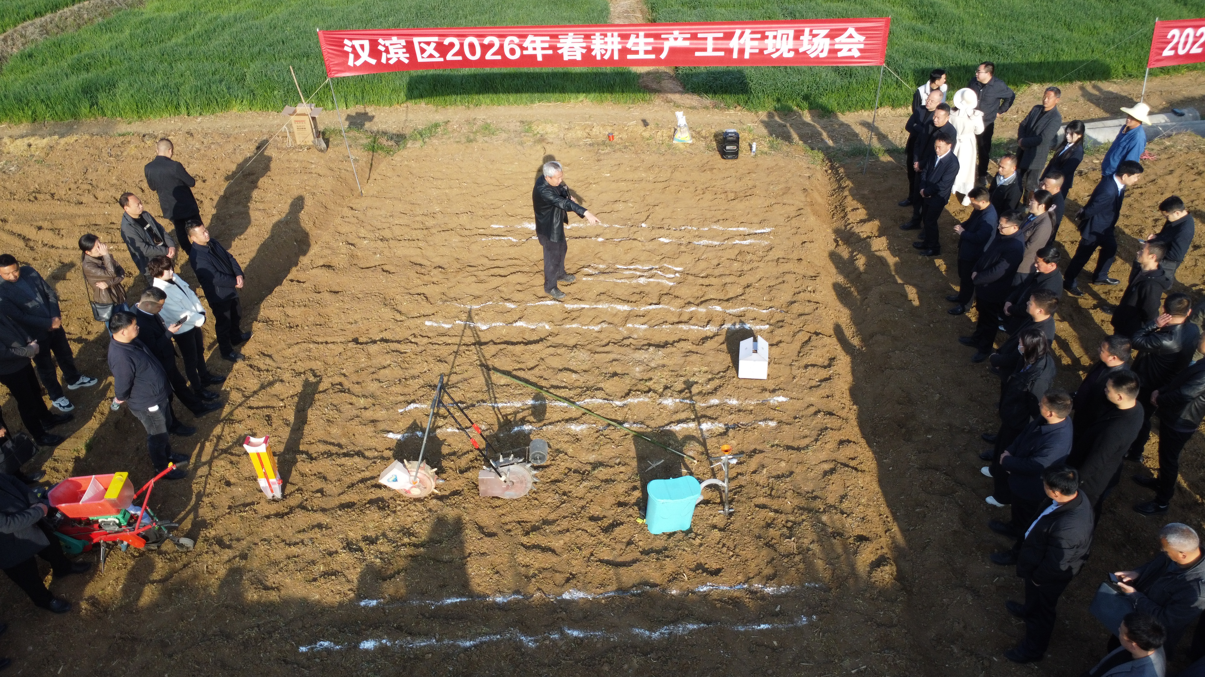 當(dāng)天上午8點半,參會的農(nóng)技人員、各鎮(zhèn)辦農(nóng)業(yè)干部、種糧大戶及周邊農(nóng)戶早已齊聚田埂,大家穿著膠鞋、褲腳高挽,不少村民更是扛著自家農(nóng)具趕來,現(xiàn)場學(xué)習(xí)春耕實操技術(shù),氛圍熱烈有序。