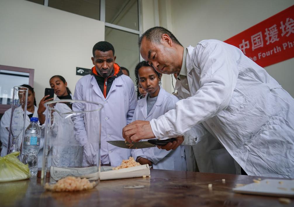 2025年8月20日,在埃塞俄比亞首都亞的斯亞貝巴,中方專家在亞的斯亞貝巴理工學院對大學生進行菌種制作技術指導。新華社記者 韓旭 攝