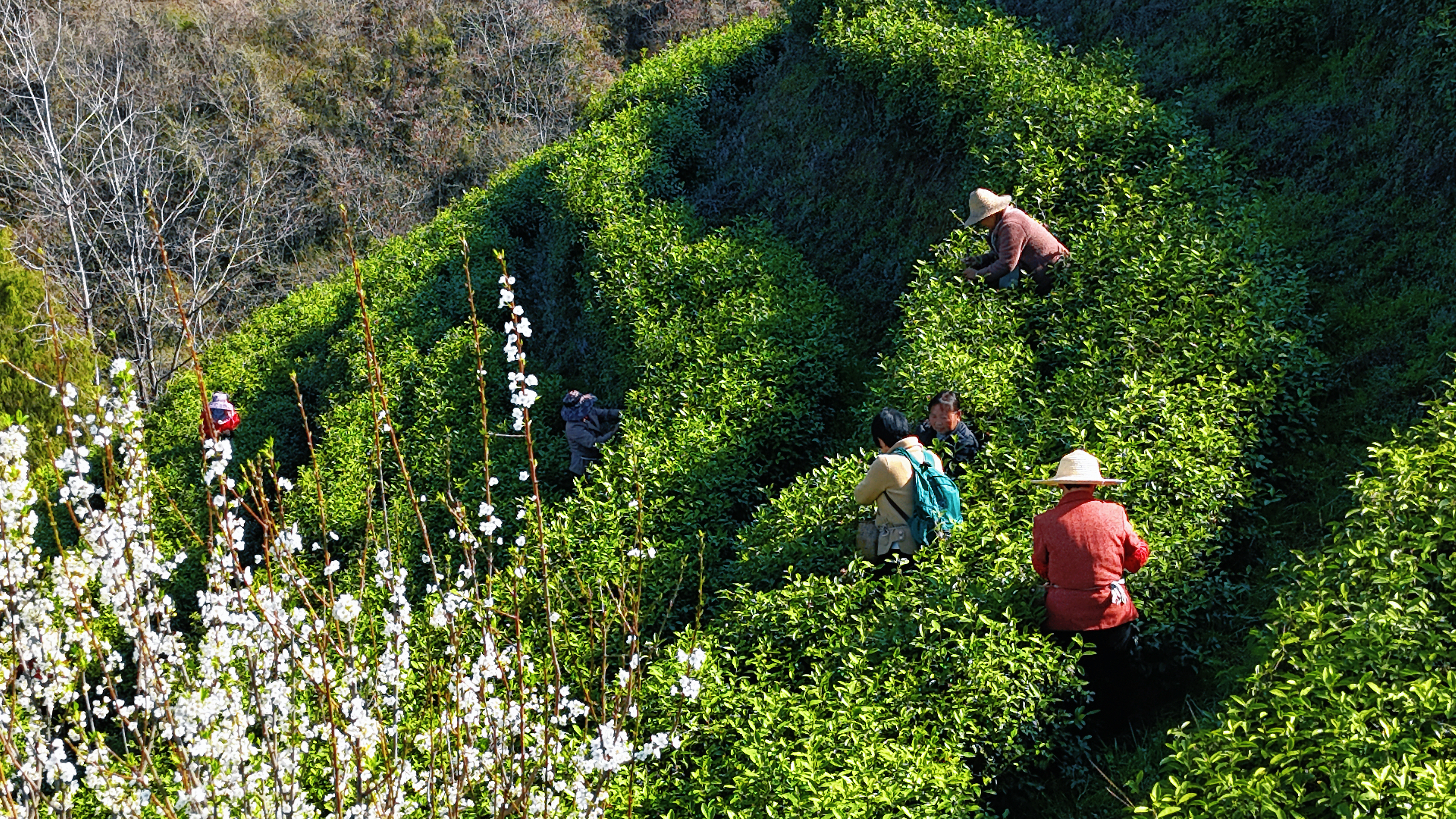 3月17日,在漢陰縣漩渦鎮(zhèn)發(fā)揚村茶園,茶農(nóng)們腰挎竹簍,在茶壟間嫻熟地采摘著今年的頭茬春茶。該茶園總面積860畝,全年產(chǎn)值穩(wěn)定在650萬元左右。王建霞 攝