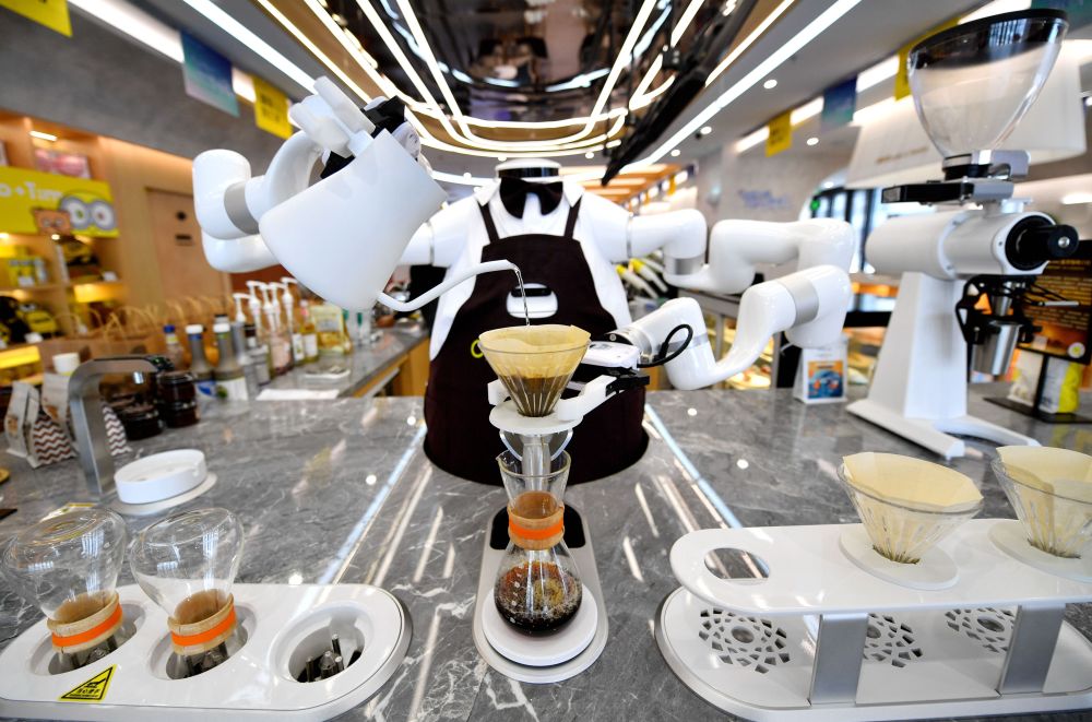 2024年1月17日,在雄安新區(qū)一家咖啡店內(nèi),AI機(jī)器人在制作咖啡。