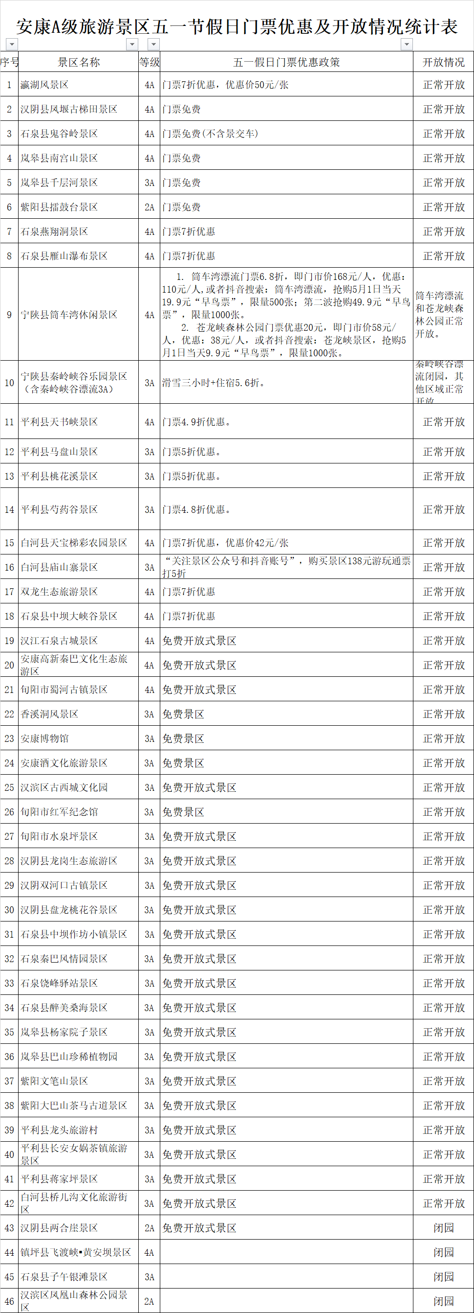 13家收費(fèi)景區(qū)推出門票打折優(yōu)惠活動(dòng):瀛湖風(fēng)景區(qū)推出“五一”期間門票7折優(yōu)惠,優(yōu)惠價(jià)50元/張;石泉燕翔洞景區(qū)、石泉縣雁山瀑布景區(qū)、石泉縣中壩大峽谷景區(qū)推出“五一”期間門票七折優(yōu)惠;雙龍生態(tài)旅游景區(qū)推出“五一”期間門票7折優(yōu)惠;平利縣天書(shū)峽景區(qū)推出“五一”期間門票4.9折優(yōu)惠;白河縣天寶梯彩農(nóng)園景區(qū)推出“五一”期間門票7折優(yōu)惠,優(yōu)惠價(jià)42元/張;平利縣馬盤山景區(qū)推出“五一”期間門票5折優(yōu)惠;平利縣桃花溪景區(qū)推出“五一”期間門票5折優(yōu)惠;平利縣芍藥谷景區(qū)推出“五一”期間門票4.8折優(yōu)惠。