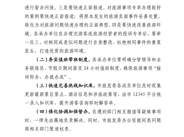 (二)夯實值班帶班制度。各承辦單位要明確分管領(lǐng)導(dǎo)和業(yè)務(wù)聯(lián)絡(luò)員,節(jié)假日期間落實24小時值班制度,確保旅游事項“接訴即辦、辦就辦成”。