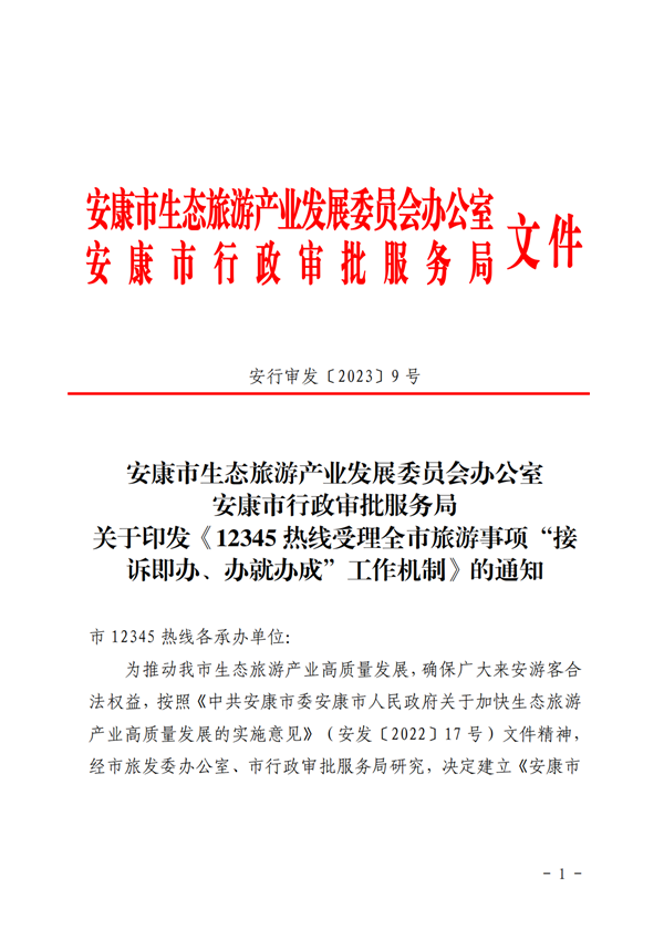 為推動我市生態(tài)旅游產(chǎn)業(yè)高質(zhì)量發(fā)展,確保廣大來安游客合法權(quán)益,按照《中共安康市委安康市人民政府關(guān)于加快生態(tài)旅游產(chǎn)業(yè)高質(zhì)量發(fā)展的實施意見》(安發(fā)〔2022〕17號)文件精神,經(jīng)市旅發(fā)委辦公室、市行政審批服務(wù)局研究,決定建立《安康市12345熱線受理全市旅游事項“接訴即辦、辦就辦成”工作機制》,請認(rèn)真抓好貫徹落實。