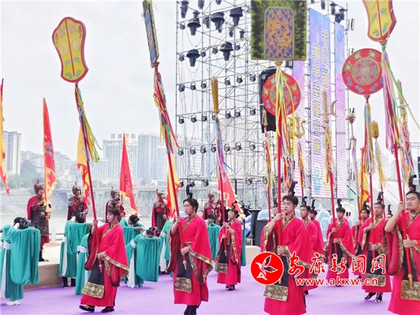 悠悠古琴聲中,青衣女子們手提竹籃蹁躚而來。“緬懷先賢”,主祭官一聲令下,全場(chǎng)矚目中,9位大漢護(hù)送屈原像至舞臺(tái)中央,開幕式翻開祭祀篇章。主祭官走向高臺(tái)仰頸高呼:“詠頌祭文……”百名身著漢服、手持竹簡(jiǎn)的孩童齊聲詠頌,頓挫抑揚(yáng),激蕩云霄。“萬民歡慶歌盛世,安瀾裕阜唱安康。”典禮儀成,青衣女子們“兵分兩列”,一列把竹籃里面的粽子拋向江中,追念先賢,一列繞場(chǎng)為現(xiàn)場(chǎng)觀眾贈(zèng)發(fā)香包,送上幸福安康的祝福。