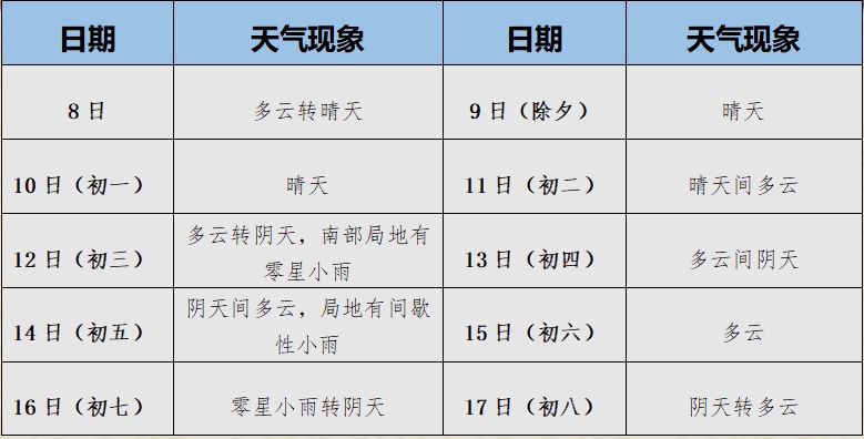 本網(wǎng)訊 2月7日10時,市氣象臺發(fā)布《春節(jié)天氣預(yù)報》:春節(jié)前期(除夕到初二)我市以晴天到多云天氣為主,氣溫回升明顯,預(yù)計全市最高氣溫升至15℃以上,東部縣區(qū)可能接近20℃;初三,陰天,南部局地零星小雨;初四,多云間陰天;初五陰天有間歇性小雨;初六多云;初七零星小雨轉(zhuǎn)陰天;初八陰天轉(zhuǎn)多云。