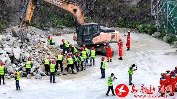 啟動(dòng)儀式上,漢陰縣介紹安全宣傳及應(yīng)急演練情況,市安委辦對(duì)全市安全生產(chǎn)月活動(dòng)再安排再部署。隨后,開(kāi)展了非煤礦山事故應(yīng)急演練。演練模擬持續(xù)強(qiáng)降雨天氣下,漢陰西鐵義德石料有限公司廠區(qū)出現(xiàn)邊坡坍塌導(dǎo)致人員、設(shè)備被掩埋險(xiǎn)情,市、縣、鎮(zhèn)、企業(yè)四級(jí)應(yīng)急救援隊(duì)伍緊急出動(dòng),展開(kāi)聯(lián)合搶險(xiǎn)救援。演練過(guò)程中,各小組緊密配合,順利完成了應(yīng)急響應(yīng)、警戒疏散、交通管制、信息上報(bào)、企業(yè)自救、傷員救治、雷達(dá)生命探測(cè)儀救援、無(wú)人機(jī)運(yùn)輸物資等演練科目,模擬險(xiǎn)情得到及時(shí)消除。本次演練場(chǎng)景逼真,貼近實(shí)戰(zhàn),實(shí)現(xiàn)了鍛煉隊(duì)伍、磨合機(jī)制,強(qiáng)化應(yīng)急處置能力的目標(biāo),無(wú)人機(jī)、生命探測(cè)儀等新技術(shù)裝備的運(yùn)用,有效提升礦山應(yīng)急救援能力。