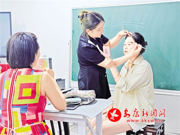 今年23歲的市民小陳在化妝課老師指導(dǎo)下學(xué)習(xí)眉形妝造