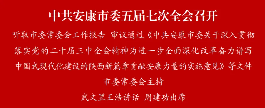 全會(huì)由市委常委會(huì)主持。市委書記武文罡講話并就《中共安康市委關(guān)于深入貫徹落實(shí)黨的二十屆三中全會(huì)精神為進(jìn)一步全面深化改革奮力譜寫中國(guó)式現(xiàn)代化建設(shè)的陜西新篇章貢獻(xiàn)安康力量的實(shí)施意見》作說(shuō)明。市委副書記、市長(zhǎng)王浩部署經(jīng)濟(jì)工作。市政協(xié)主席周建功出席會(huì)議。市委常委、統(tǒng)戰(zhàn)部部長(zhǎng)、政法委書記寇全安就《中共安康市委關(guān)于在中國(guó)式現(xiàn)代化道路上建設(shè)平安祥和幸福安康的實(shí)施意見》作說(shuō)明,市委常委、市紀(jì)委書記、市監(jiān)委主任羅曉君就《中共安康市委關(guān)于在中國(guó)式現(xiàn)代化道路上建設(shè)風(fēng)清氣正幸福安康的實(shí)施意見》作說(shuō)明。