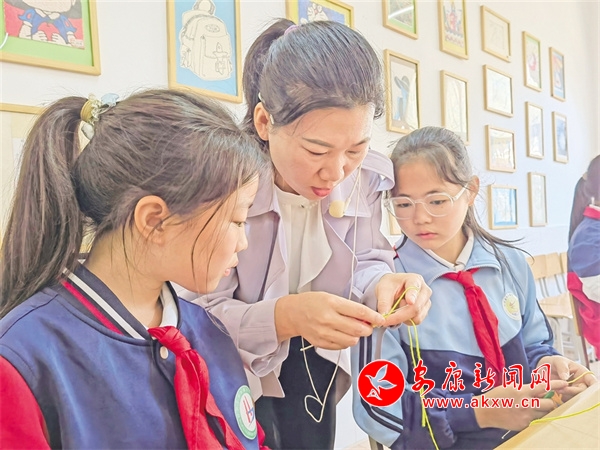 倉上鎮(zhèn)中心小學編織社團老師在教授編織技巧