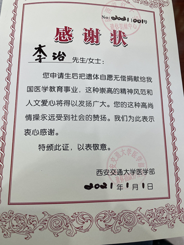 15年來,李治還積極資助困難學生、為災區(qū)捐資捐物,為他人、為社會付出了很多,但他總覺得不夠。2021年,他自愿申請并成功登記為遺體捐獻志愿者。“這是我那年送給自己的新年禮物。”他指著西安交通大學醫(yī)學部的感謝狀說。RKM安康新聞網