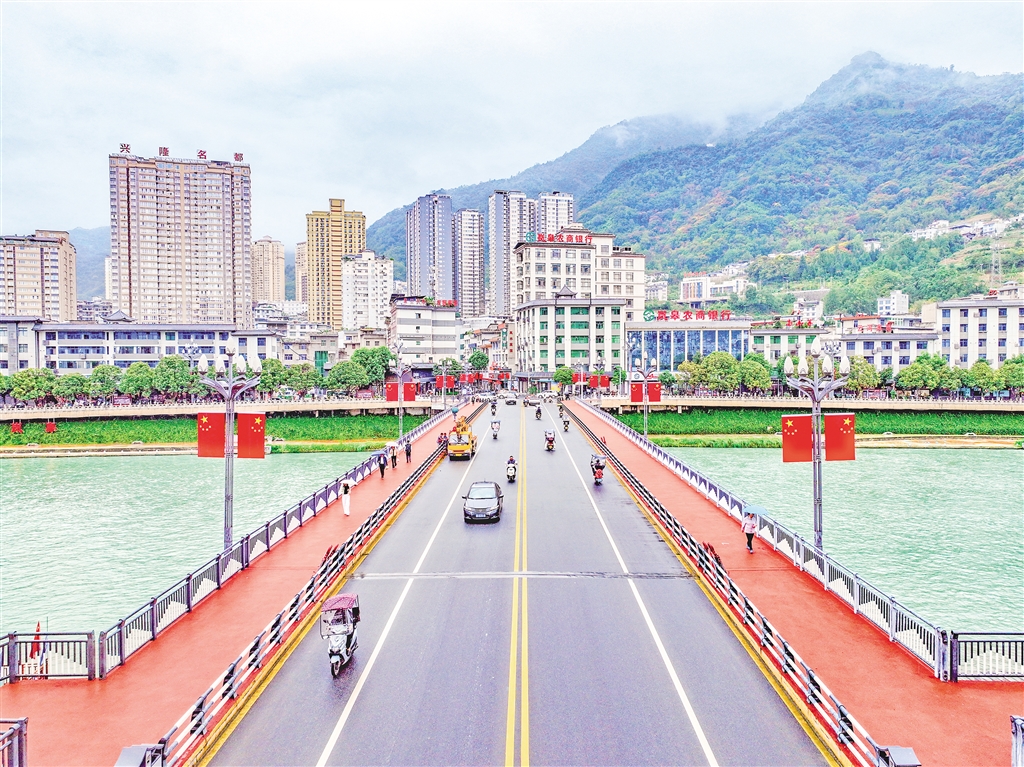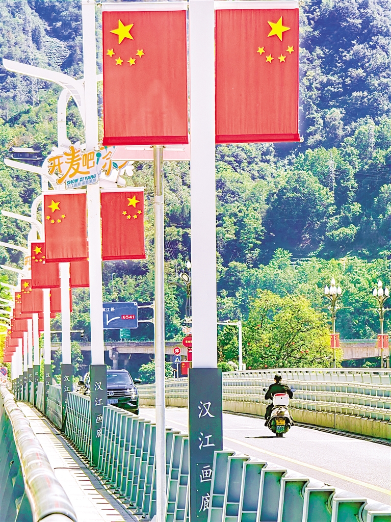 在嵐皋縣大橋兩側(cè),一面面整齊的五星紅旗迎風(fēng)飄揚(yáng),喜迎國(guó)慶。 李王灝 攝wxP安康新聞網(wǎng)