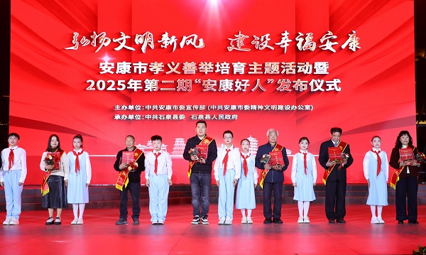 本次活動以“弘揚(yáng)文明新風(fēng) 建設(shè)幸福安康”為主題,由市委宣傳部主辦、石泉縣委和縣政府承辦,旨在深入學(xué)習(xí)貫徹黨的二十屆四中全會精神,扎實(shí)推進(jìn)崇德向上幸福安康建設(shè);顒蝇F(xiàn)場,通過播放典型人物短片、現(xiàn)場互動訪談等形式,生動再現(xiàn)了陳登發(fā)、高虎、黃壽琴等好人代表的感人事跡。市級領(lǐng)導(dǎo)及“中國好人”“陜西好人”等先進(jìn)典型代表為28名新入選的“安康好人”頒發(fā)紀(jì)念證書;顒蝇F(xiàn)場同時發(fā)布了2025年安康市“新時代好少年”名單,24名青少年獲得殊榮。