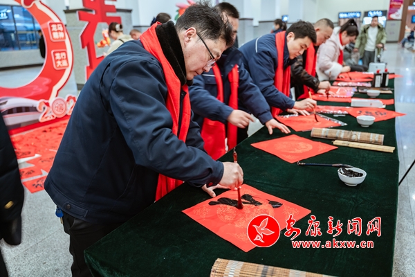 活動另一邊,7名來自安康地區(qū)的鐵路書法家們在候車室內(nèi)揮毫潑墨,一氣呵成,將一副副飽含著美好祝愿的春聯(lián)和一張張洋溢著節(jié)日喜慶的“福”字送到旅客手中,讓旅客的春運旅途充滿濃濃“年味”。