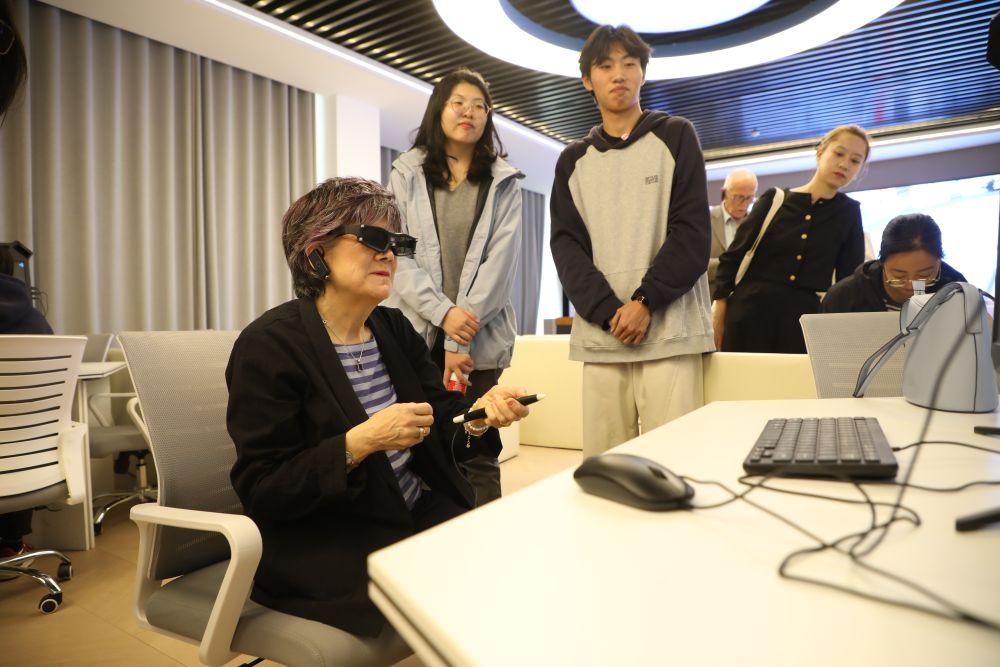 4月15日,在培黎職業(yè)學(xué)院,英中了解協(xié)會(huì)榮譽(yù)主席佐伊·里德體驗(yàn)學(xué)生們親手設(shè)計(jì)搭建的虛擬現(xiàn)實(shí)場(chǎng)景模型。新華社記者 張智敏 攝FUY安康新聞網(wǎng)