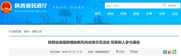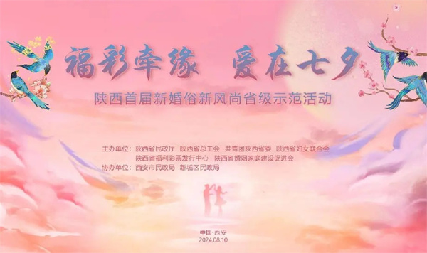 今年的8月10日,是中國傳統(tǒng)的七夕佳節(jié),為大力推進婚姻領(lǐng)域移風易俗,引導新人樹立文明、健康、理性的婚戀觀,陜西省民政廳等4部門計劃舉辦“福彩牽緣 愛在七夕”陜西省首屆新婚俗新風尚省級示范活動,現(xiàn)面向全省招募新人。