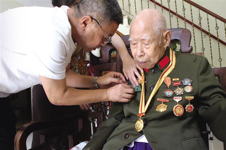8月22日,99歲的我省抗戰(zhàn)老戰(zhàn)士劉炳榮佩戴國家頒發(fā)的“中國人民抗日戰(zhàn)爭勝利80周年”紀(jì)念章。 本報通訊員 吳寬宏攝5HQ安康新聞網(wǎng)