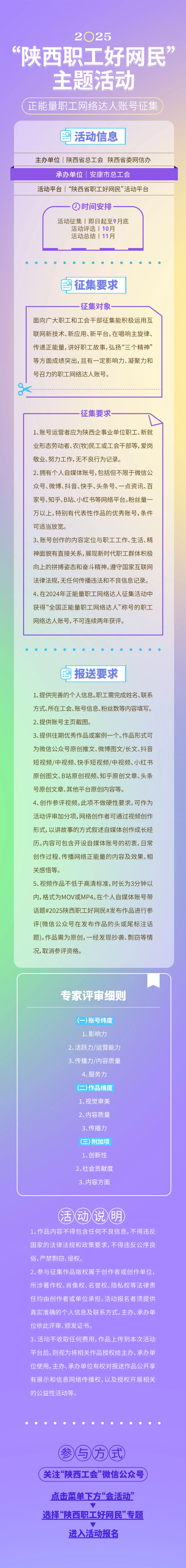 2025年“陜西職工好網(wǎng)民”正能量職工網(wǎng)絡(luò)達(dá)人賬號(hào)征集