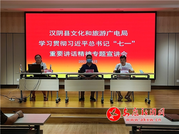 本網(wǎng)訊(通訊員 成濤)為深入學(xué)習(xí)宣傳貫徹習(xí)近平總書記在慶祝中國(guó)共產(chǎn)黨成立100周年大會(huì)上的重要講話精神,引導(dǎo)廣大黨員干部深刻領(lǐng)會(huì)把握“七一”重要講話的重大意義。8月11日下午,漢陰縣文化和旅游廣電局舉辦學(xué)習(xí)貫徹習(xí)近平總書記“七一”重要講話精神專題宣講會(huì)。
