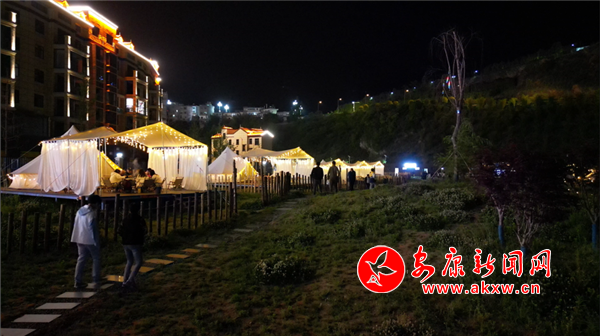 假期第一天,記者來到位于城關(guān)鎮(zhèn)羅景坪社區(qū)的嵐谷森野露營基地,只見藍天白云下,統(tǒng)一的白色帳篷在寬敞的草地上依次排開,游樂設施散布其間,人們或躺或臥,或游戲或拍照,一派快樂、安逸的假日氛圍。夜幕降臨,點點彩燈為夜晚的露營基地增添了一抹童話色彩,大家吹著徐徐晚風,吃著各色美食,享受著與家人朋友暢談暢飲的歡樂時光。