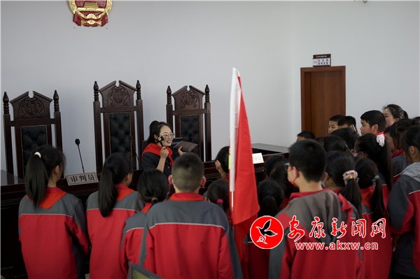 在參觀過程中,干警帶領(lǐng)同學(xué)們走進(jìn)訴訟服務(wù)中心和干警辦公室了解了法院干警的工作場所。隨后,帶領(lǐng)同學(xué)們參觀審判庭,現(xiàn)場向同學(xué)們介紹科技審判法庭的功能及庭審流程,并展示了法袍、法槌和法徽,同時(shí)用深入淺出的語言和提問互動的方式向孩子們講解了法袍、法槌和法徽的象征意義,同學(xué)們興趣濃厚,紛紛走上審判臺,親身感受和觸摸審判設(shè)施,感受法庭審判的嚴(yán)肅和莊重。