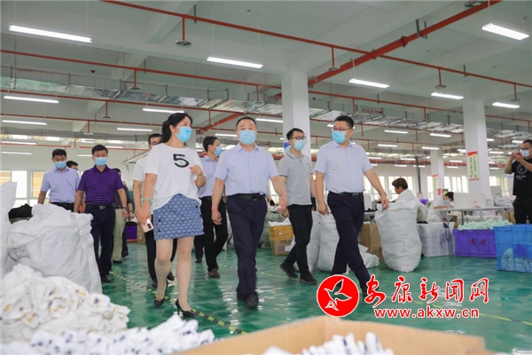 市長武文罡(右三)在五里工業(yè)集中區(qū)新樂祥襪業(yè)調(diào)研ycA安康新聞網(wǎng)